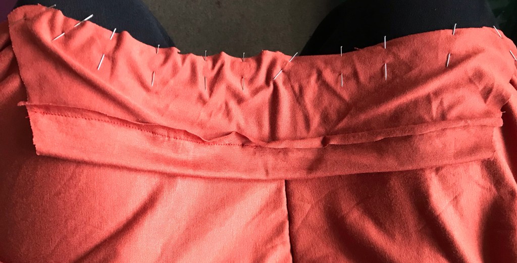 Fold the neckline and stitch down front and back. I did this but turning down the neckline where it joins the shoulder and then i did the centre fold and worked my way along each side. It’s important not to stretch your neckline at this point so take it slowly and use lots of pins. Also remember this stitching will be visible so stitch the fold down from the Right Side and lengthen the stitch.