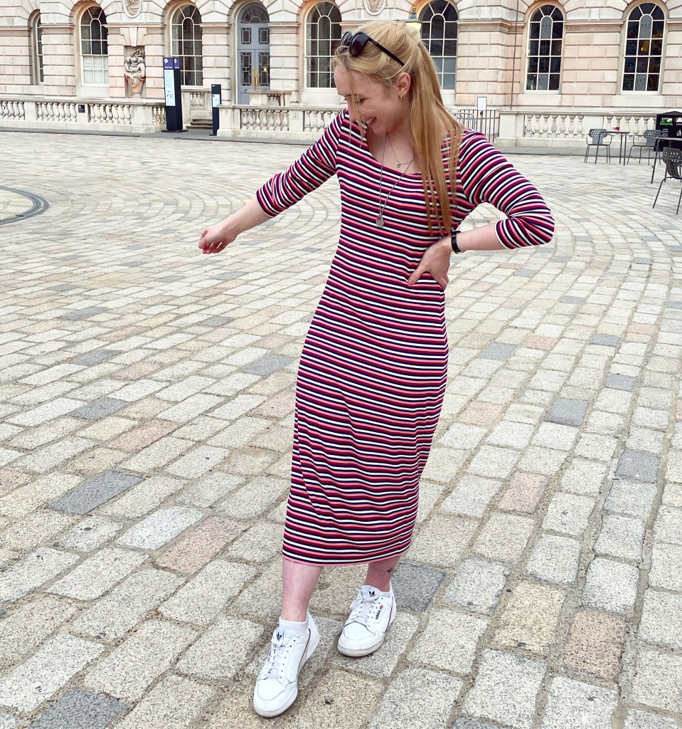 Last week(w/c 11th) I was working on an exhibition opening and I have to say my me-made work wardrobe really came into its own. I wore my second Chalk & Notch Fringe Dress – which to tell the truth isn’t completely finished( I still need to sort the sleeves) but I wore it anyway and no one noticed so I’m counting that as a win. Then for the night of the private view I got my favourite Nina Lee Portobello trousers out – stylish, elegant, and space for two phones and an epi-pen in the pockets and a radio on the waistband! Then on Maundy Thursday the sun shone and I unearthed a make I had completely forgotten about. This McCalls M7531 midi dress(shown on the left) in a super cute pink stripey ribbed jersey from Sew Much Moor. It was funny, I was sat in bed on Wednesday night trying to figure out what to wear, I was going into the office and then having dinner in London in the evening with a friend so needed an outfit to do both. Then as I scrolled through my instagram account my me-made wardobe came galloping to the rescue! This dress was made in October and the fabric is far too thin to wear in the winter so I had just sort of forgotten about it but I love that even though the fabric is lightweight, the length helps to keep you warm and cosy, I love how comfortable it is while still looking smart, and I love the colours. Now that this make has been brought to the front of the wardrobe, I know it will be getting top billing for the rest of the spring/summer.